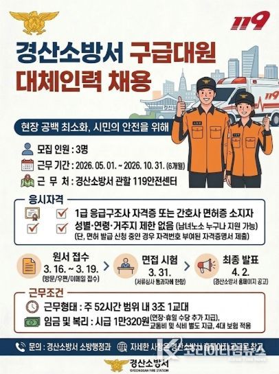 코리아타임뉴스 김태훈 기자 | 경산소방서가 구급현장 공백을 최소화하기 위해 구급대원 대체인력 채용에 나선다.