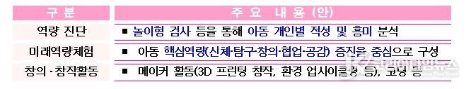 어린이들이 단순히 역할 체험자에 그치지 않고 능동적 참여자로서 몰입하여 활동할 수 있는 실험, 탐색, 창작, 협업 등의 요소에 중점을 두게 된다.