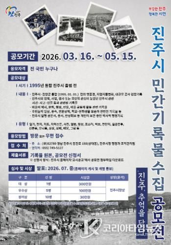 코리아타임뉴스 경남취재본부 | 진주시는 사라져가는 지역의 옛 모습과 시민들의 소중한 생활사를 체계적인 기록 자산으로 보존하기 위해 ‘진주시 민간 기록물 수집 공모전: 진주, 추억을 담다’를 개최한다고 밝혔다.
