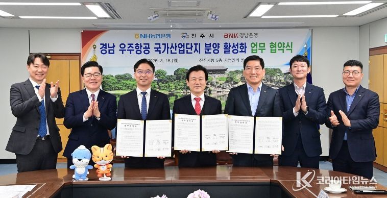코리아타임뉴스 경남취재본부 | 진주시는 16일 시청 기업인의 방에서 NH농협은행, BNK경남은행과 ‘경남 우주항공 국가산업단지 분양 활성화’를 위한 업무협약을 체결했다고 밝혔다.