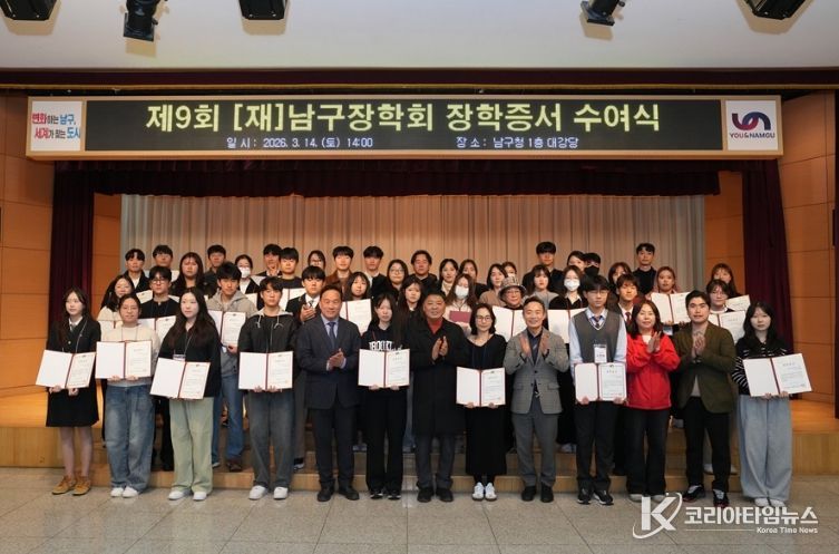 코리아타임뉴스 부산취재본부 | (재)부산광역시 남구장학회(이사장 김태유)는 지난 3월 14일 남구청 대강당에서 장학생과 학부모 등 80여 명이 참석한 가운데 2026년도 남구장학회 장학 증서 수여식을 개최했다.