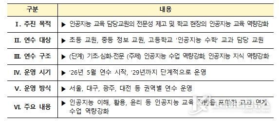 교육부와 한국교육학술정보원(원장 정제영)이 협력하여 개발한 이 연수 과정은 교육 내용으로 인공지능 기술의 이해·활용·윤리에 대한 사항을 포괄하고 있으며, 교과 수업과 연계된 교수·학습 역량을 강화하는 데 중점을 둔 것이 특징이다. 특히, 인공지능의 개념과 원리, 최신 인공지능 기술의 교육적 활용, 인공지능 윤리와 사회적 영향 등을 균형 있게 반영하여 인공지능 전반을 아우르는 연수 체계를 구축했다.