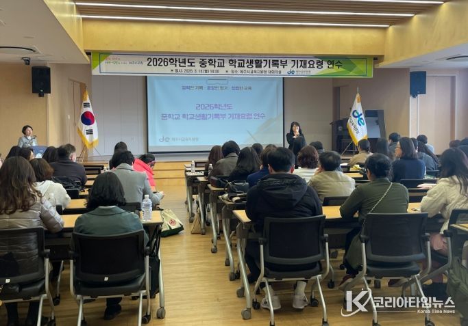 코리아타임뉴스 사회팀 | 제주시교육지원청은 16일 제주시교육지원청 대회의실에서 학교생활기록부의 공정성과 신뢰도 제고를 위해 제주시 관내 중학교 교원 96명 대상으로 ‘2026학년도 학교생활기록부 기재요령 연수’를 실시했다.