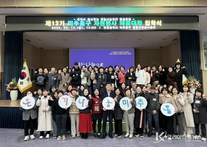 코리아타임뉴스 이아름 기자 | 인천 미추홀구종합자원봉사센터(센터장 유중형)는 지난 13일 미추홀구청 대회의실에서 ‘2026 미추홀구 자원봉사 배움 대학 입학식’을 진행했다.