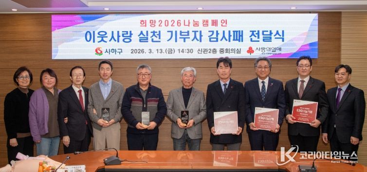 코리아타임뉴스 이아름 기자 | 부산 사하구는 부산사회복지공동모금회(회장 이수태)와 지난 13일 '희망2026나눔캠페인 이웃사랑 실천 기부자 감사패 전달식'을 개최해 지역사회 나눔을 실천한 기부자들에게 감사의 뜻을 전했다고 밝혔다.