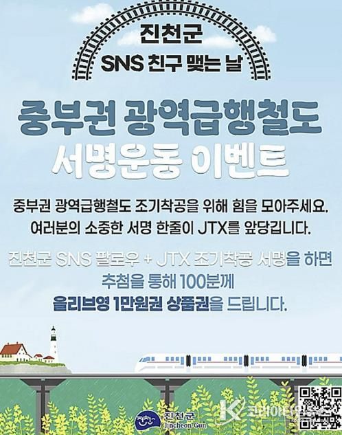 코리아타임뉴스 충북취재본부 | 충북 진천군이 ‘중부권 광역급행철도(JTX)’ 조기 착공을 위한 군민과 국민의 관심을 모으기 위해 오는 3월 29일까지 SNS 서명운동 참여 이벤트를 진행한다.