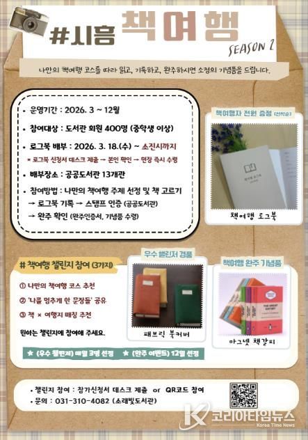 코리아타임뉴스 경기취재본부 | 시흥시도서관은 시민의 독서 실천을 지원하고 일상 속 독서문화를 확산하기 위해 3월 18일부터 ‘2026 시흥 책여행(시즌2)’ 로그북을 배부하고, ‘책여행 로그북 챌린지’를 함께 운영한다.