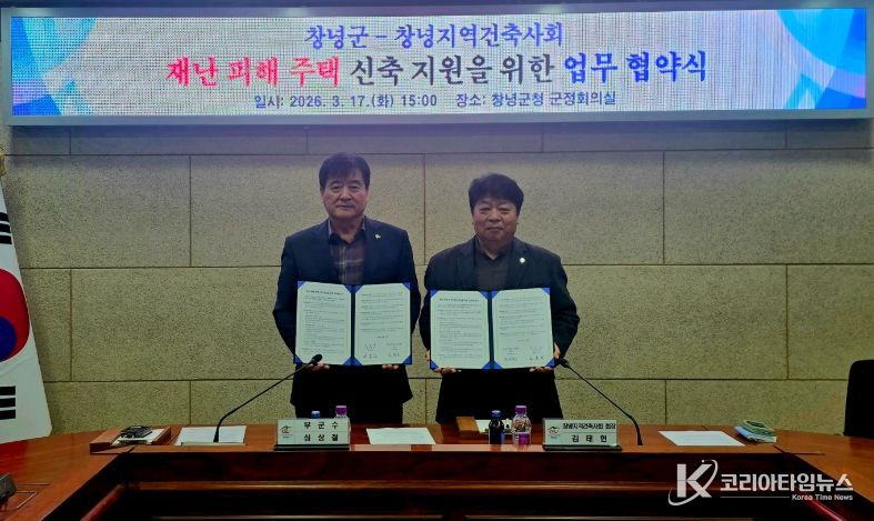 코리아타임뉴스 경남취재본부 | 창녕군과 창녕지역건축사회(회장 김태헌)는 지난 17일 군청 군정회의실에서 ‘재난 피해 주택 신축 지원 업무협약’을 체결했다고 밝혔다.