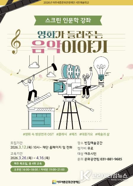 코리아타임뉴스 문화팀 | 여주세종문화관광재단은 오는 26일부터 시민예술학교 프로그램의 일환으로 ‘스크린 인문학 강좌–영화가 들려주는 음악 이야기’를 운영한다.