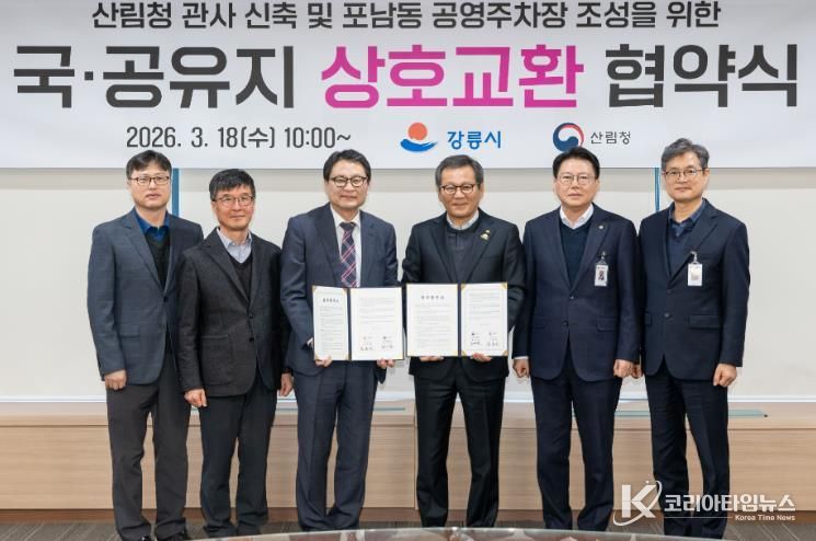 코리아타임뉴스 이아름 기자 | 강릉시와 동부지방산림청은 18일 강릉시청에서 포남동 공영주차장 조성을 위한 국·공유지 교환 업무협약을 체결했다.