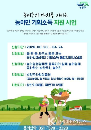 코리아타임뉴스 경기취재본부 | 남양주시는 오는 23일부터 ‘2026년 농어민 기회소득 지원사업’을 신청받는다고 18일 밝혔다.