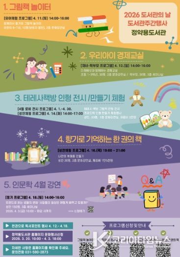 코리아타임뉴스 경기취재본부 | 남양주시는 ‘2026년 도서관의 날·도서관주간’을 맞아 정약용도서관에서 4월 한 달간 전시와 체험, 강연 등 다양한 독서문화 프로그램을 운영한다고 18일 밝혔다.