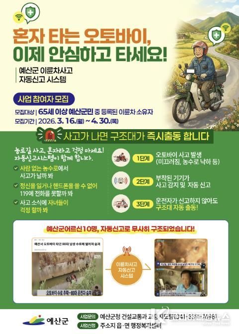 코리아타임뉴스 김택호 기자 | 예산군은 이륜차사고 발생 시 자동 신고를 통해 신속한 구조를 지원하는 ‘이륜차사고 자동신고 시스템 운영’ 사업을 추진한다.