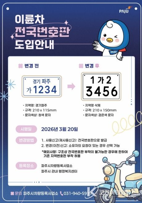 코리아타임뉴스 윤광희 기자 | 파주시는 오는 20일부터 이륜차 전국번호판 제도를 본격 시행한다.