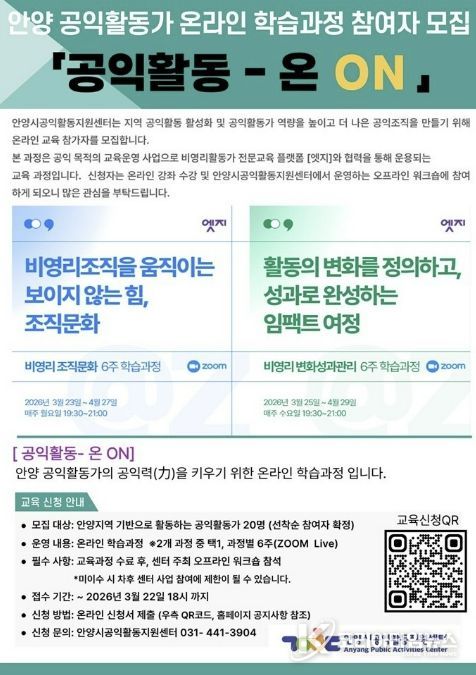 코리아타임뉴스 사회팀 | 안양시공익활동지원센터가 지역 공익활동가들의 철학적 토대를 다지는 교육을 성공적으로 마친 데 이어, 실천적 전문성을 높이기 위한 온라인 교육 과정을 본격 가동하며 활동가 지원에 박차를 가하고 있다.