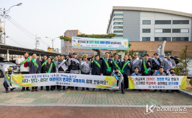 코리아타임뉴스 경북취재본부 | 칠곡군은 3월17일 왜관초등학교 어린이 보호구역에서 칠곡경찰서, 칠곡교육지원청, 녹색어머니회, 장애인협회, 모범운전자회 등 관내 기관·단체 70여 명이 합동으로 어린이 교통안전 캠페인을 펼쳤다.