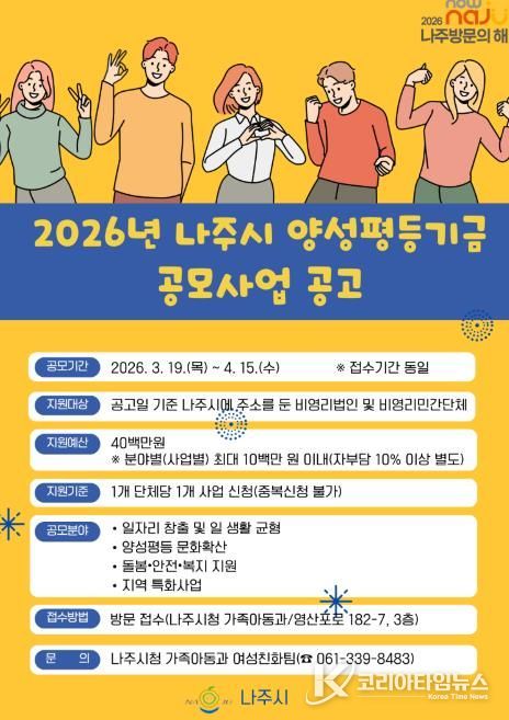 코리아타임뉴스 전남취재본부 | 전남 나주시가 일·생활 균형과 양성평등 문화 확산, 돌봄과 안전 복지 지원을 위한 ‘2026년 나주시 양성평등기금 공모사업’을 추진한다.