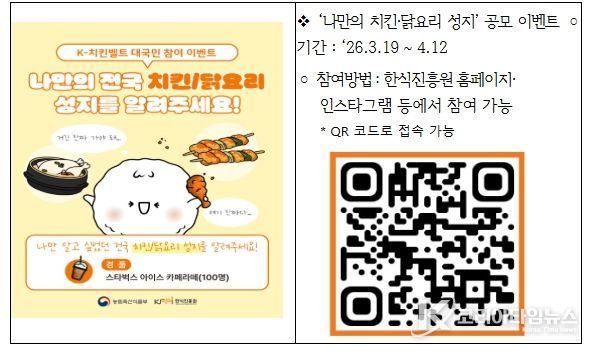 코리아타임뉴스 오영주 기자 | 농림축산식품부는 2026년 3월 19일, 한국관광공사 서울센터에서 전 세계인이 가장 사랑하는 한식인 치킨을 필두로 전국의 다양한 닭요리와 지역 관광자원을 결합한 K-치킨벨트(K-미식벨트) 구축 계획을 공식 발표했다.