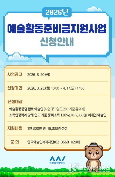 코리아타임뉴스 윤경수 기자 | 문화체육관광부는 한국예술인복지재단과 함께 3월 23일부터 4월 17일까지 ‘2026년 예술활동준비금’ 지원 신청을 받는다.