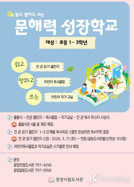 코리아타임뉴스 전남취재본부 | 광양시는 어린이들의 기초학습 역량인 문해력을 높이기 위해 4월부터 광양희망도서관과 광양꿈빛도서관에서 ‘문해력 성장학교’를 운영한다.