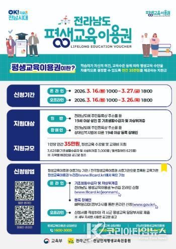 코리아타임뉴스 윤경수 기자 | 전라남도와 전남인재평생교육진흥원은 오는 27일까지 저소득층과 장애인을 대상으로 ‘2026 전라남도 평생교육이용권’ 1차 신청을 받는다고 밝혔다.