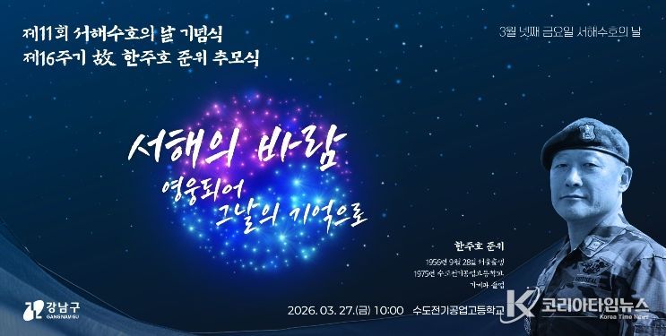 코리아타임뉴스 기동취재팀 | 꿈이 모이는 도시, 미래를 그리는 강남구가 3월 27일 수도전기공업고등학교에서 ‘제11회 서해수호의 날 기념식’과 ‘제16주기 故 한주호 준위 추모식’을 연다. 주민, 학생, 보훈단체, 군 관계자 등 500여 명이 함께할 예정이다.