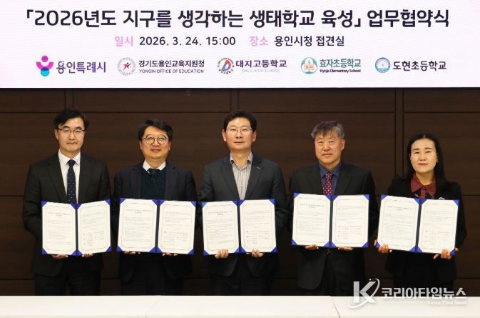 코리아타임뉴스 사회팀 | 용인특례시는 24일 시청 접견실에서 용인교육지원청을 비롯해 3개 학교와 ‘지구를 생각하는 생태학교 육성사업’을 위한 협약을 맺었다.
