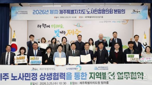 제주특별자치도는 25일 도청 탐라홀에서 2026년 제1차 제주노사민정협의회 본회의를 열어 ‘산업대전환 대응과 일터 위험격차 해소를 위한 제주특별자치도 노사민정 공동선언문’을 채택하고, 노사발전재단과 상생협력 업무협약을 체결했다.