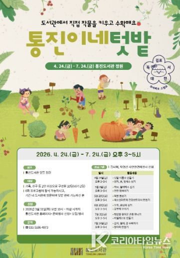 코리아타임뉴스 문화팀 | 김포시 통진도서관은 도서관에서 직접 작물을 키우고 수확하며 생태 감수성을 키우는 체험형 프로그램 ‘통진이네 텃밭’을 오는 4월 24일부터 7월 24일까지 운영한다.