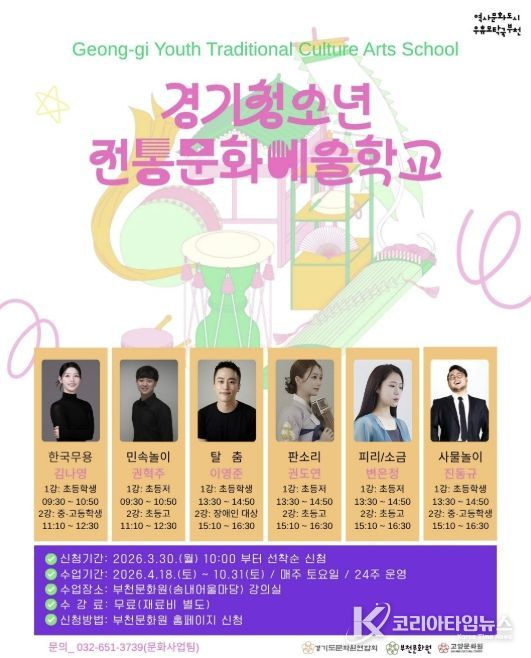 코리아타임뉴스 경기취재본부 | 부천문화원은 청소년들의 전통문화 참여 기회를 확대하고 경기지역 전통민속예술의 지속 가능한 전승 기반 마련을 위한 ‘2026 경기청소년전통문화예술학교’ 참여 학생을 모집한다.
