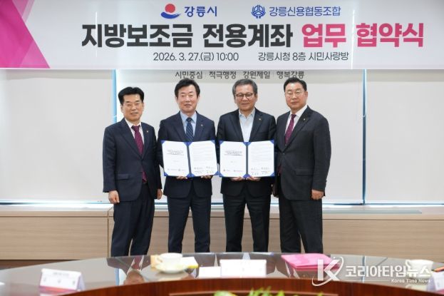 코리아타임뉴스 김택호 기자 | 강릉시는 3월 27일 10시 시청 8층 시민사랑방에서 강릉신협과 지방보조금 전용계좌 업무협약을 체결했다. 이날 협약식에는 강릉신협 김남철 이사장, 관동신협 이상혁 이사장, 동인병원신협 황상명 이사장을 비롯한 강릉시 관내 신협 임원진이 참석했다.