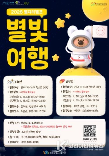코리아타임뉴스 문화팀 | 부평구청소년수련관은 지역 내 11~16세 청소년을 대상으로 천문 과학 별자리 체험 프로그램인 2026 별자리캠프 ‘별빛여행’ 참가자를 모집한다.