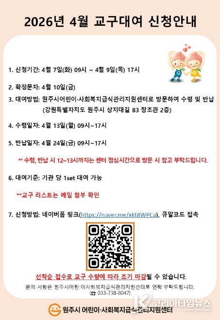 코리아타임뉴스 이아름 기자 | 원주시어린이·사회복지급식관리지원센터는 2026년 ‘어린이 교구 대여 사업’을 실시한다.
