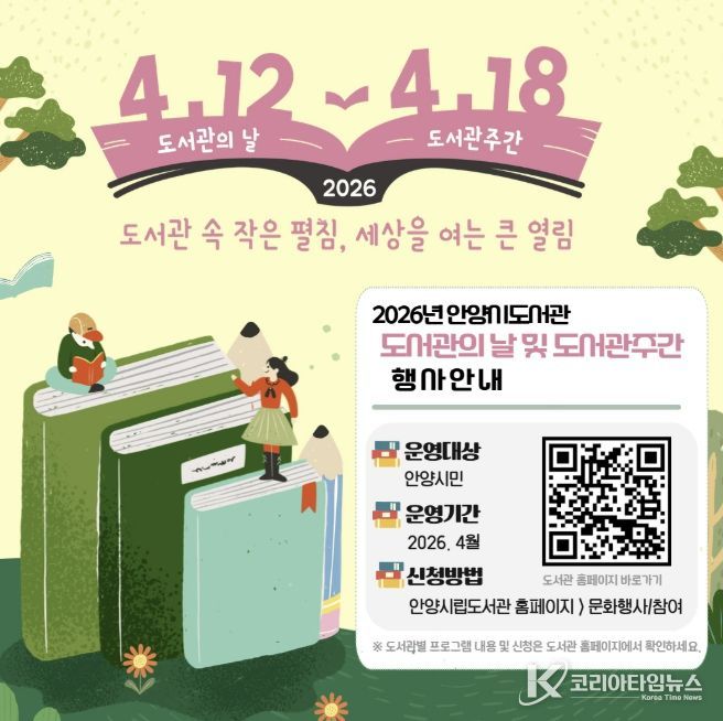 코리아타임뉴스 이아름 기자 | 안양시 관내 10개 공공도서관이 제4회 ‘도서관의 날’과 제62회 ‘도서관 주간’을 맞아 ‘도서관 속 작은 펼침, 세상을 여는 큰 열림’이라는 주제로 다채로운 독서문화행사를 개최한다.