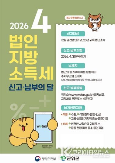 코리아타임뉴스 노승선 기자 | 군위군은 오는 4월 30일까지 2025년 귀속 사업연도 법인소득에 관한 법인지방소득세 신고 및 납부 기간을 운영한다고 1일 밝혔다.