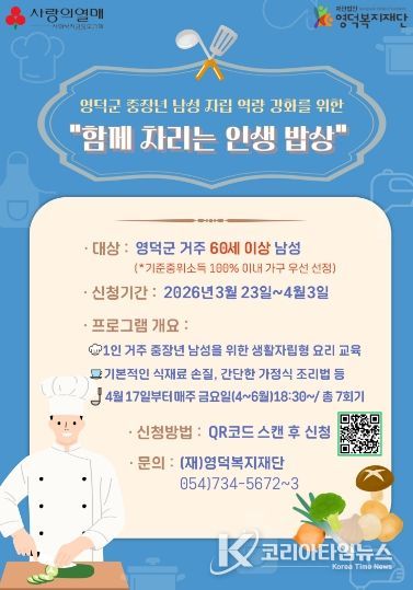 코리아타임뉴스 노승선 기자 | 영덕복지재단(이사장 김명용)은 관내 중장년 1인 가구 남성들의 건강한 자립을 지원하기 위해 식생활 교육 프로그램 ‘함께 차리는 인생 밥상’의 참여자를 다음 달 3일까지 모집한다.