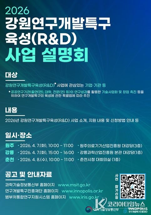 코리아타임뉴스 김택호 기자 | 연구개발특구진흥재단과 강원특별자치도는 ‘2026년 강원연구개발특구육성(R·D) 사업 설명회’를 4월 7일 원주·강릉, 8일 춘천에서 개최한다고 밝혔다.