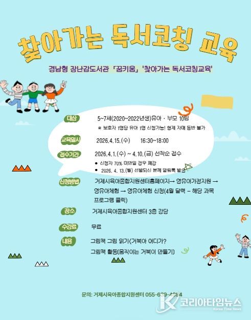코리아타임뉴스 경남취재본부 | 거제시육아종합지원센터는 오는 4월 15일, 거제시 관내 5~7세 영유아 자녀를 둔 가정을 대상으로 ‘찾아가는 독서코칭 교육’을 실시한다.