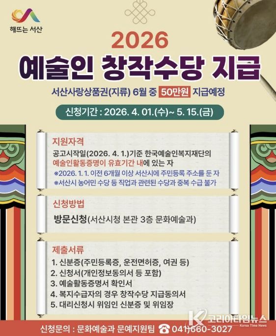 신청 기간은 4월 1일부터 5월 15일까지며, 서산시 문화예술과에 방문 신청하면 된다.