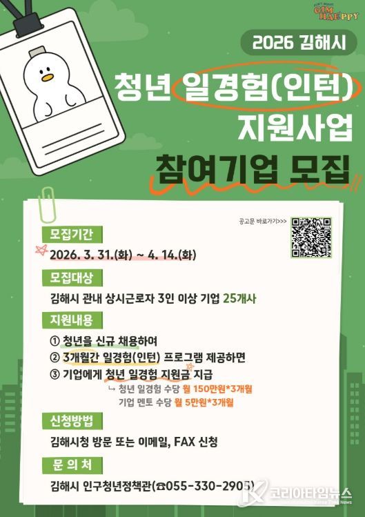 코리아타임뉴스 경남취재본부 | 김해시는 미취업 청년에게 기업 직무 경험 기회를 제공하는 청년 일경험(인턴) 지원사업 참여기업을 모집한다고 1일 밝혔다.