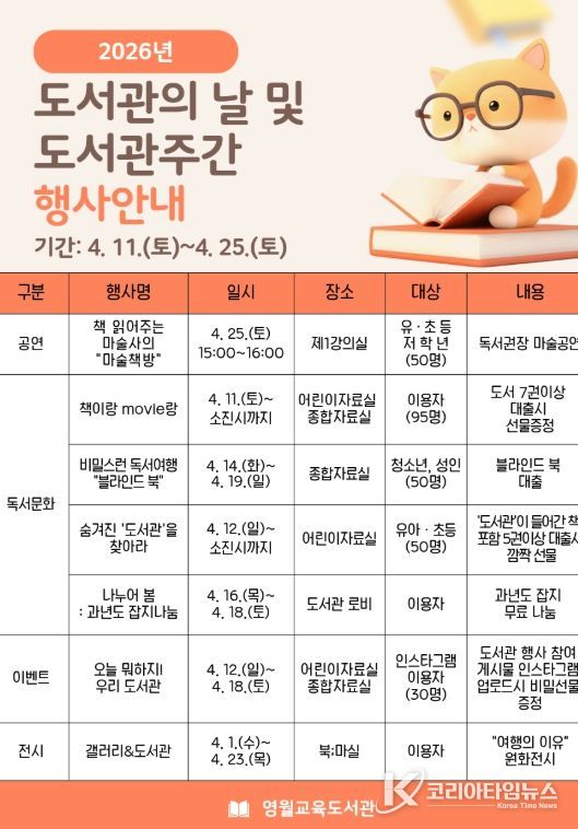 코리아타임뉴스 이아름 기자 | 영월교육도서관은 오는 4월 11일부터 25일까지 지역주민을 대상으로 도서관의 날 및 도서관 주간 행사를 운영한다.