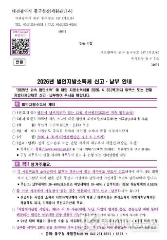 코리아타임뉴스 대전취재본부 | 대전 동구는 법인세 납세의무가 있는 12월 결산법인을 대상으로 오는 30일까지 법인지방소득세 집중 신고기간을 운영한다고 1일 밝혔다.