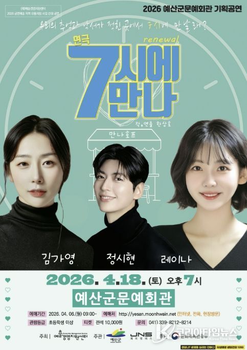 코리아타임뉴스 김택호 기자 | 예산군문예회관은 (재)예술경영지원센터 ‘2026 공연예술 유통지원 사업’ 공모에 4개 작품이 선정돼 국비 1억4000만 원을 확보하고 첫 공연으로 오는 4월 18일 오후 7시 연극 ‘7시에 만나’를 선보인다고 밝혔다.