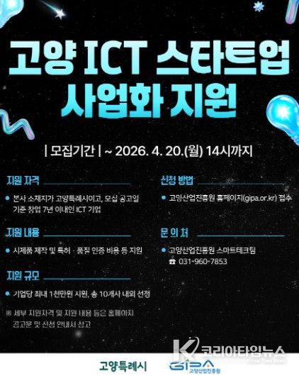 코리아타임뉴스 기동취재팀 | 고양산업진흥원이 ‘2026년 고양 ICT 스타트업 사업화 지원사업’ 참여 기업을 모집한다.