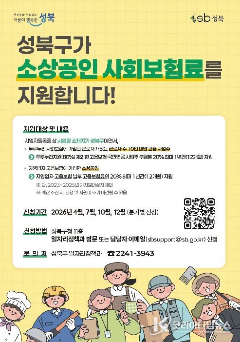 코리아타임뉴스 사회팀 | 서울 성북구가 4월 13일부터 17일까지 2026년 '성북구 소상공인 사회보험료 지원사업' 1분기 신청 접수를 진행한다.