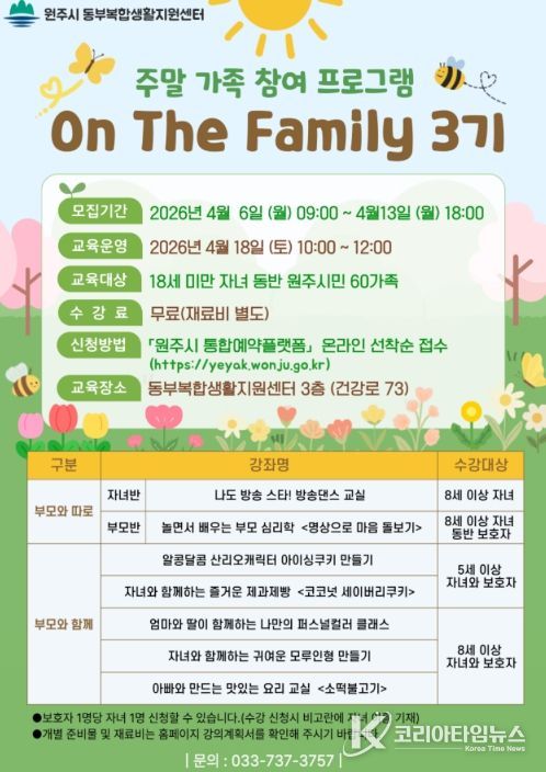 코리아타임뉴스 이아름 기자 | 원주시 동부복합생활지원센터는 오는 18일, 주말 가족 참여 프로그램 ‘온 더 패밀리(On The Family)’ 3기 과정을 운영한다.