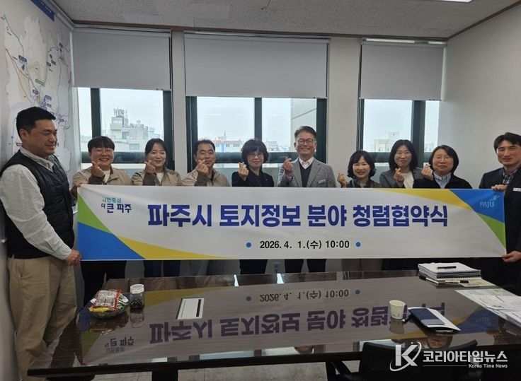 코리아타임뉴스 윤광희 기자 | 파주시는 지난 1일 지적측량 수행기관인 한국국토정보공사 파주지사와 ‘토지정보 분야 청렴협의체’를 구성하는 내용으로 협약을 체결했다.