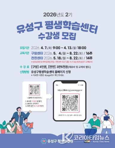 코리아타임뉴스 대전취재본부 | 대전 유성구는 오는 7일부터 13일까지 구암평생학습센터와 전민평생학습센터에서 ‘2026년 2기 평생학습센터’ 수강생을 모집한다.