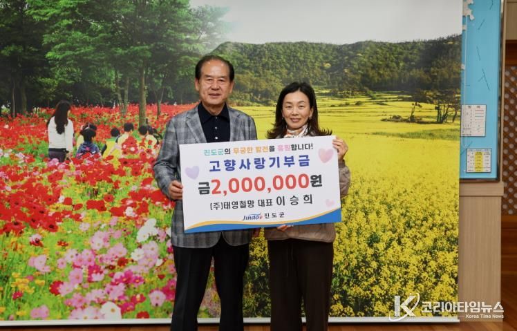 코리아타임뉴스 노승선 기자 | 진도군에 소재하는 ㈜태영철망의 이승희 대표는 지난 3월 30일 진도군청을 방문해, 지역 발전과 군민의 복리 증진을 위해 고향사랑기부금 200만 원을 기부 했다.