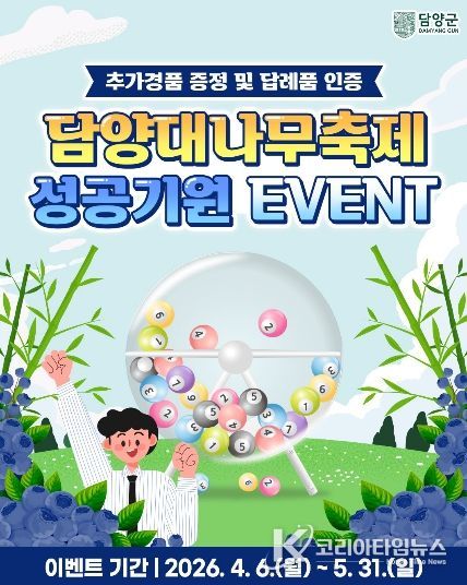 ‘제25회 담양대나무축제 성공기원’이벤트는 4월 6일부터 5월 15일까지 40일간 진행되며, 이벤트 기간 내 담양군에 10만 원 이상 기부하면 별도의 신청 절차 없이 자동으로 응모된다.